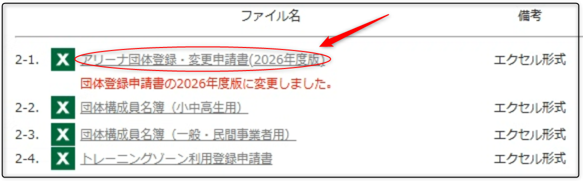 アリーナ団体登録・変更申請書の書式が2026年度版に変更されました。